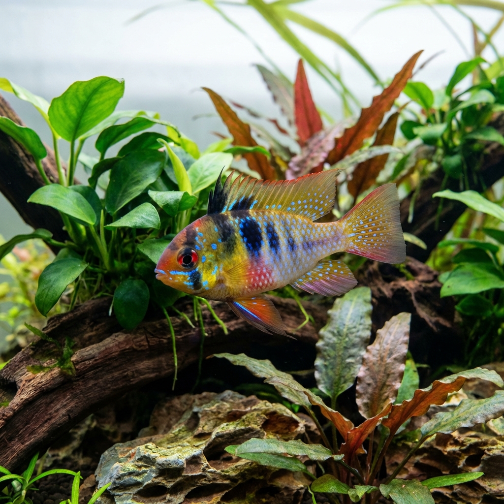 is a stunning dwarf cichlid with electric blue and gold colouration. While not impossibly difficult, they're at the upper limit of what beginners should attempt.